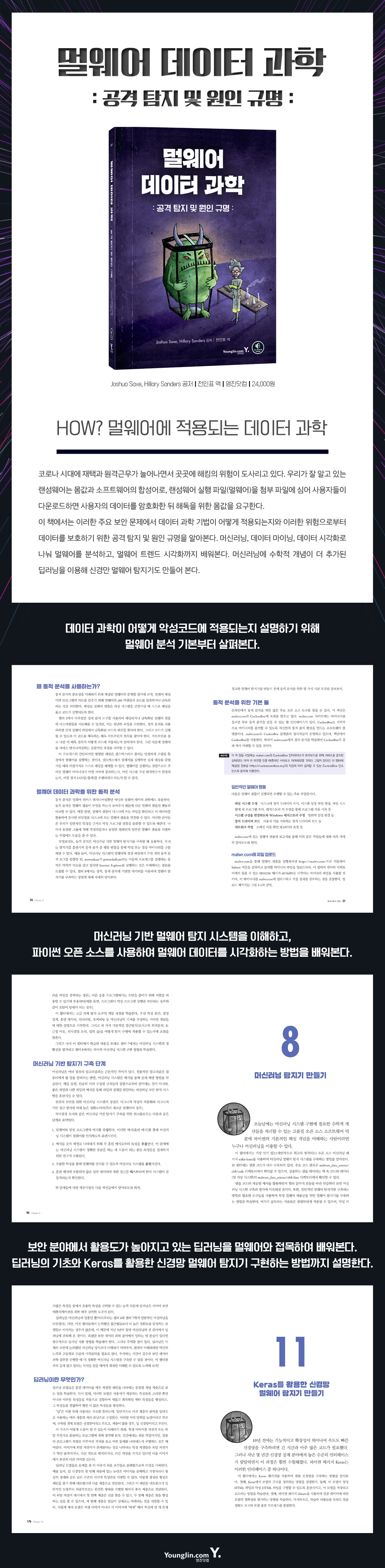 이 책은 보안 데이터 과학자인 저자가 멀웨어를 데이터 과학에 적용하여 공격 탐지 및 인텔리전스 시스템을 구축할 때 머신러닝, 통계 및 데이터 시각화 적용하는 방법 등을 알려준다.