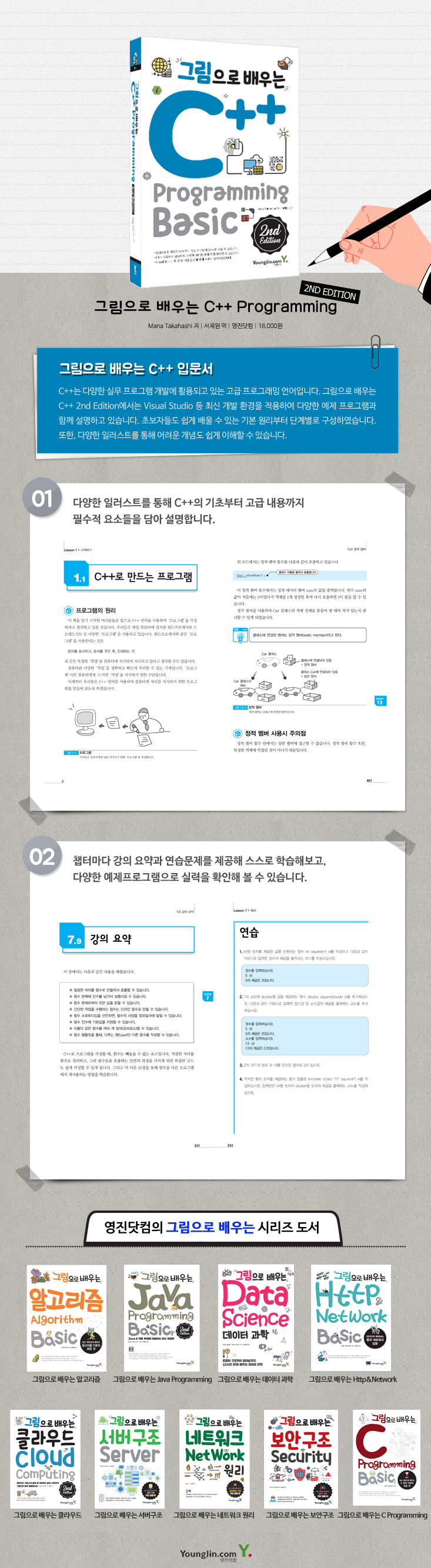 C++는 다양한 실무 프로그램 개발에 활용되는 고급 프로그래밍 언어입니다. 이 책은 기존 출간된 <그림으로 배우는 C++ 프로그래밍>의 개정판 도서로, Visual Studio 등 최신 개발 환경을 적용하여 다양한 예제 프로그램과 함께 설명하고 있습니다. 초보자들도 쉽게 배울 수 있는 기본 원리부터 단계별로 구성하였습니다. 다양한 일러스트를 통해 어려운 개념을 설명하고, 예제 프로그램과 강의 요약, 연습문제를 통해 C++을 스스로 학습하고 평가할 수 있습니다.