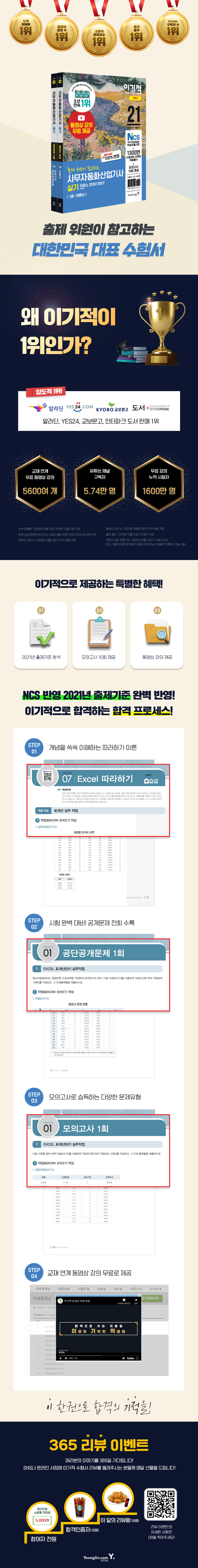 2권에서는 공단에서 직접 공개한 공단공개문제 12회를 상세한 해설과 함께 수록하고, 모의고사 10회까지 총 22회분의 문제를 풀어보며 시험을 완벽하게 준비할 수 있도록 하였습니다. 5회분까지 모의고사를 풀며 학습해보시고, 6회부터는 PDF를 제공하여 드리니 실제 시험처럼 시험지를 가지고 시간을 재며 실전감각을 익혀보세요!(영진닷컴 이기적 홈페이지 자료실에서 제공)