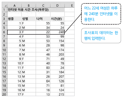 아래 도표처럼 조사표를 사용해 인터넷 이용 시간에 관한 설문조사를 실시했다고 생각해봅시다.