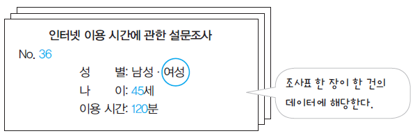 이 경우에 한 사람분의 조사 결과인 조사표 한 장이 한 건의 데이터입니다. 한 건의 데이터인 조사표에 No., 성별, 나이, 이용 시간이라는 세부항목이 있는 것이죠.