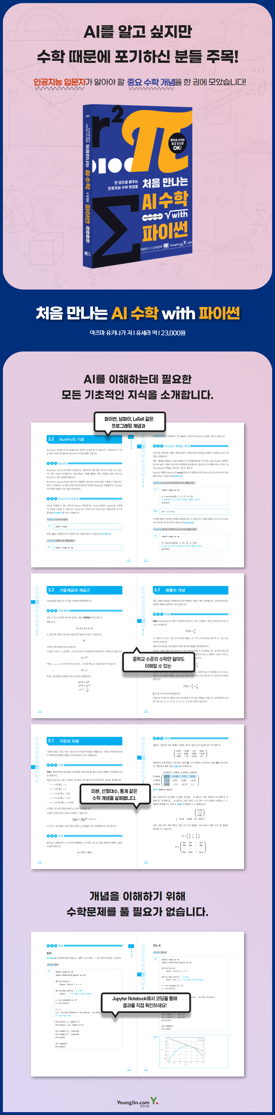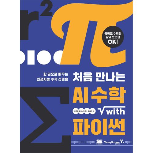<처음 만나는 AI 수학 with Python>은 인공지능을 공부하는데 기본이 되는 수학 개념을 소개하는 도서로 독자가 수학을 잘 하도록 만드는 것이 아니라 필요한 개념을 이해하도록 돕는데 목적을 두고 있다.