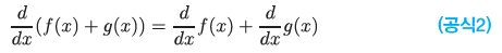 또한, 함수의 함 f(x) + g(x)를 미분할 때는 각각을 미분해서 더합니다.
