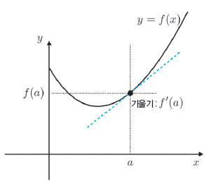 함수 f(x)상의 어떤 점, (a, f(a))에서의 기울기는 f'(a)가 됩니다.