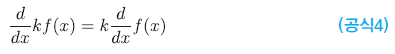 상수는 미분의 밖으로 나올 수 있습니다. k를 임의의 실수로 했을 때, 다음의 공식이 성립됩니다.