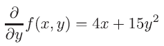이러한 편미분에 의해 구한 함수를 편도함수라고 합니다. 이 경우, 편도함수는 y의 값을 고정했을 때의 x의 변화에 대한 f(x, y)의 변화의 비율이 됩니다. f(x, y)의 y에 의한 편미분은 다음과 같습니다. 이 경우 x는 상수로서 취급합니다.
