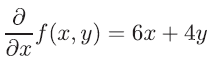 이 함수를 편미분합니다. 편미분일 때는 y를 상수로서 취급, 미분의 공식을 이용해서 x로 미분합니다. 이로써 다음의 식을 얻을 수 있습니다. 편미분에서는 d가 아닌 ∂기호를 사용합니다.