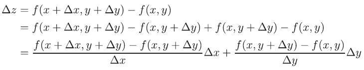 함수 z=f(x, y)를 생각합시다. x의 미소한 변화를 Δx, y의 미소한 변화를 Δy로 하면 z의 미소한 변화 Δz는 다음과 같습니다.