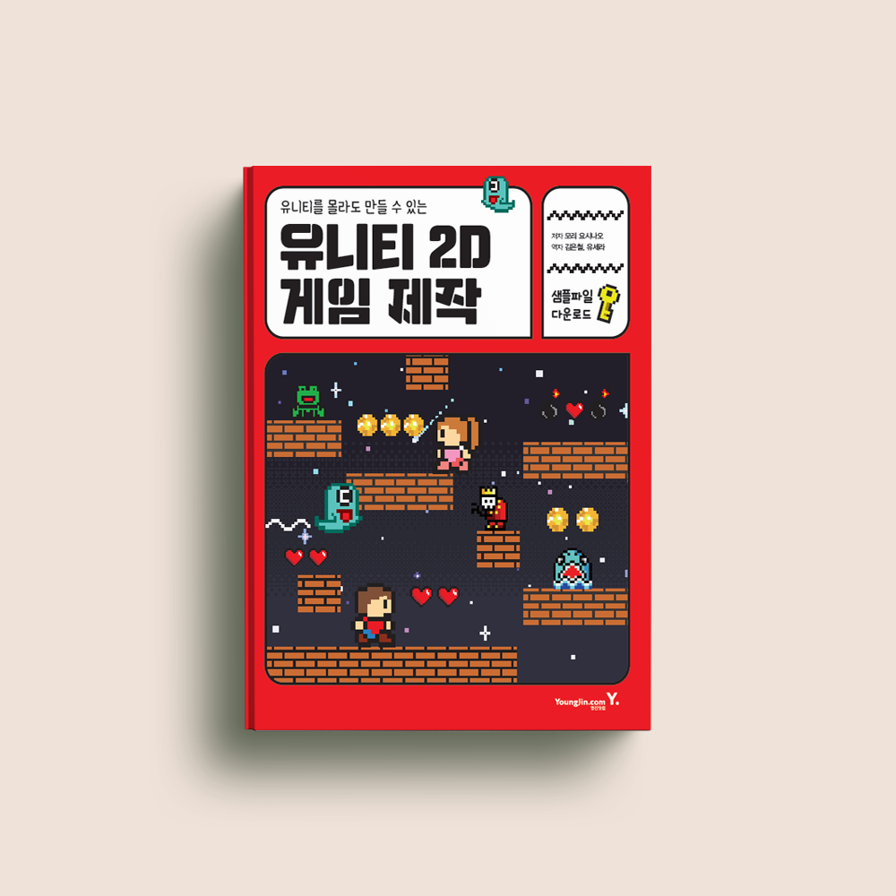 그림은 게임 중에 등장하는 캐릭터, 배경, 아이템, 버튼 등 눈에 보이는 모든 것입니다. 2D 게임의 화면 은 「그림」을 화면에 나열해서 만듭니다. 안타깝게도 이 「그림」은 Unity로 만들 수 없기 때문에 따로 준비해야 합니다. 그림을 잘 그린다면 「CLIP STUDIO Paint」나 「Adobe Photoshop CC」 등의 그래픽 소프트웨어를 사용해 직접 그림을 그려서 준비합시다. 그렇지 않다면 그림을 찾아서 사용하는 방법이 있습니다. 《유니티 2D 게임 제작》책에서도 샘플 그림을 준비합니다. 영진닷컴 홈페이지에서 샘플 그림을 다운로드해서 받아 놓으세요.