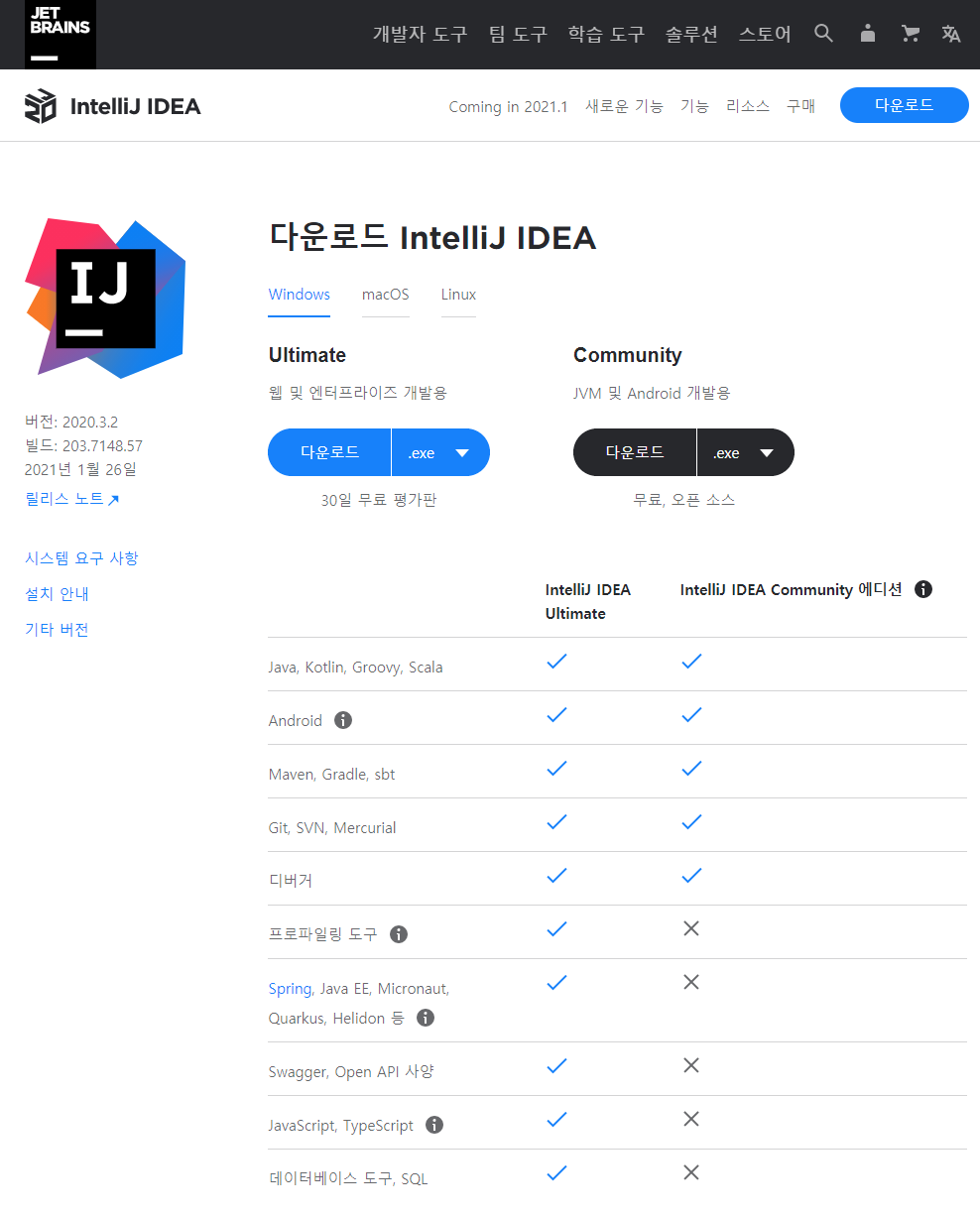 이미 최신 버전의 IntelliJ IDEA를 사용 중이라면 코틀린이 IDE와 함께 설치되었을 것이다. IntelliJ IDEA가 없다면 공식 웹사이트(www.jetbrains.com/ko-kr/idea/download)에서 Community 에디션을 다운받아 설치하면 된다. IntelliJ만 있다면 코드를 컴파일하고 실행시킬 준비는 끝났다.