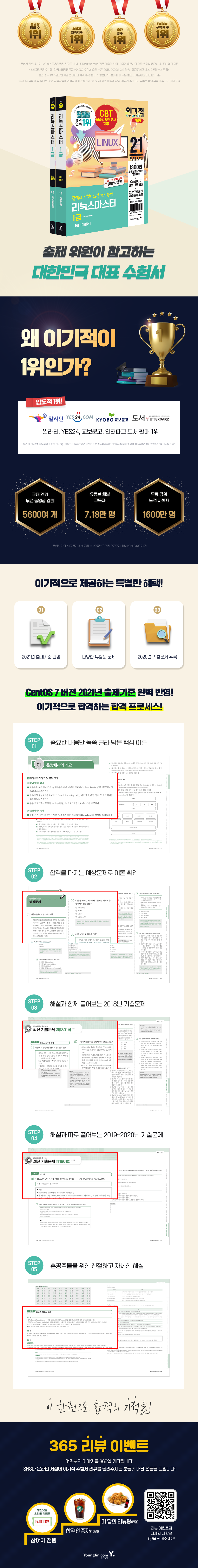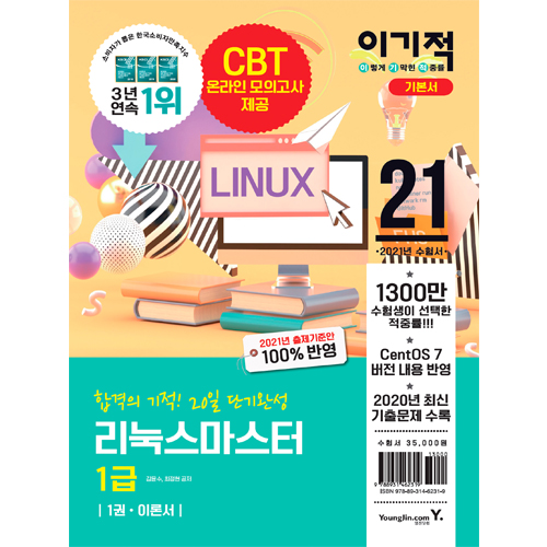 떠오르는 신흥 강자! 리눅스마스터 1급 2021년 도서가 드디어 영진닷컴에서 출간되었습니다. 시행처에서 발표한 출제기준에 맞는 핵심이론 내용과 이론을 공부한 뒤 바로 문제를 풀어볼 수 있는 구성은 수험생들이 스스로 어떤 내용을 더 공부해야 하는지, 어떤 내용에 더 집중해야 하는지 확인할 수 있도록 도와드릴 것입니다. 또한 가장 최신의 2020년 2회 기출문제까지 모두 수록하여 2021년 시험에 대비할 수 있도록 하였습니다. 어떤 자격증을 공부하든 가장 중요한 것은 기출문제를 많이 풀어보는 것입니다. 혼자서도 공부할 수 있도록 리눅스마스터 1급의 12차 내용을 모두 자세하게 풀이하였습니다. 수험생 여러분의 리눅스마스터 1급 합격을 이기적에서 응원합니다!