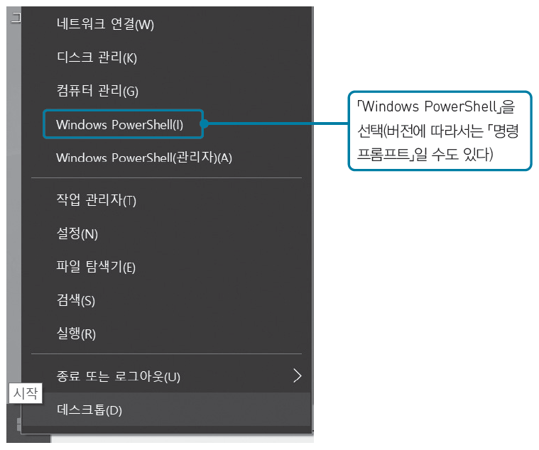 1. 「시작」 버튼을 클릭하고, 「Windows PowerShell」을 선택합니다.