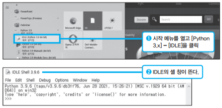 IDLE은 파이썬 프로그램을 입력하면 바로 실행할 수 있는 개발 도구이며, 프로그램 파일을 작성하기 위한 편집기 기능도 가지고 있습니다.