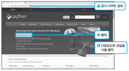 python은 공식 사이트에서 설치 프로그램을 무료로 다운로드 할 수 있습니다. 아래에서는 windows 판의 설치 방버을 설명하나, 같은 사이트에서 macOS 판도 다운로드 할 수 있습니다.