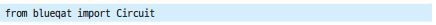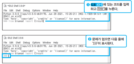 이것은 Blueqat 라이브러리에서 circuit(서킷) 객체를 import(불러온다)한다는 의미입니다. Blueqat을 이용하는 프로그램의 코드 앞부분에 반드시 써야 합니다. IDLE에는 코드를 작성할 준비가 되었음을 안내하는 '>>>"이 표시되고 있을 것입니다. 이것을 프롬프트(또는 커서)라고 하고, 이 프롬프트 바로 옆에 프로그램 코드를 입력합니다. Blueqat이 성공적으로 설치되었다면 다음 줄에 '>>>'가 표시됩니다.