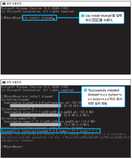 파이썬 설치가 완료되면 Blueqat을 설치합니다. python에서는 pip 명령어로 라이브러리를 설치합니다. Blueqat 이외에 numpy(넘파이)와 scipy(사이파이)가 필요합니다.