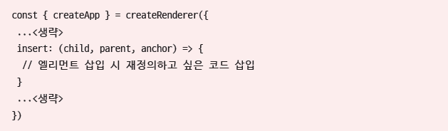 Vue 3가 제공하는 runtime-dom과 runtime-core 패키지는 사용자가 렌더링의 동작을 정의할 수 있게 해주는 createRenderer라는 함수를 제공한다. 이 함수는 Host 환경의 Node와 Element를 제네릭 인자로 받아 해당 노드와 엘리먼트의 렌더링 동작을 변경할 수 있게 해준다.