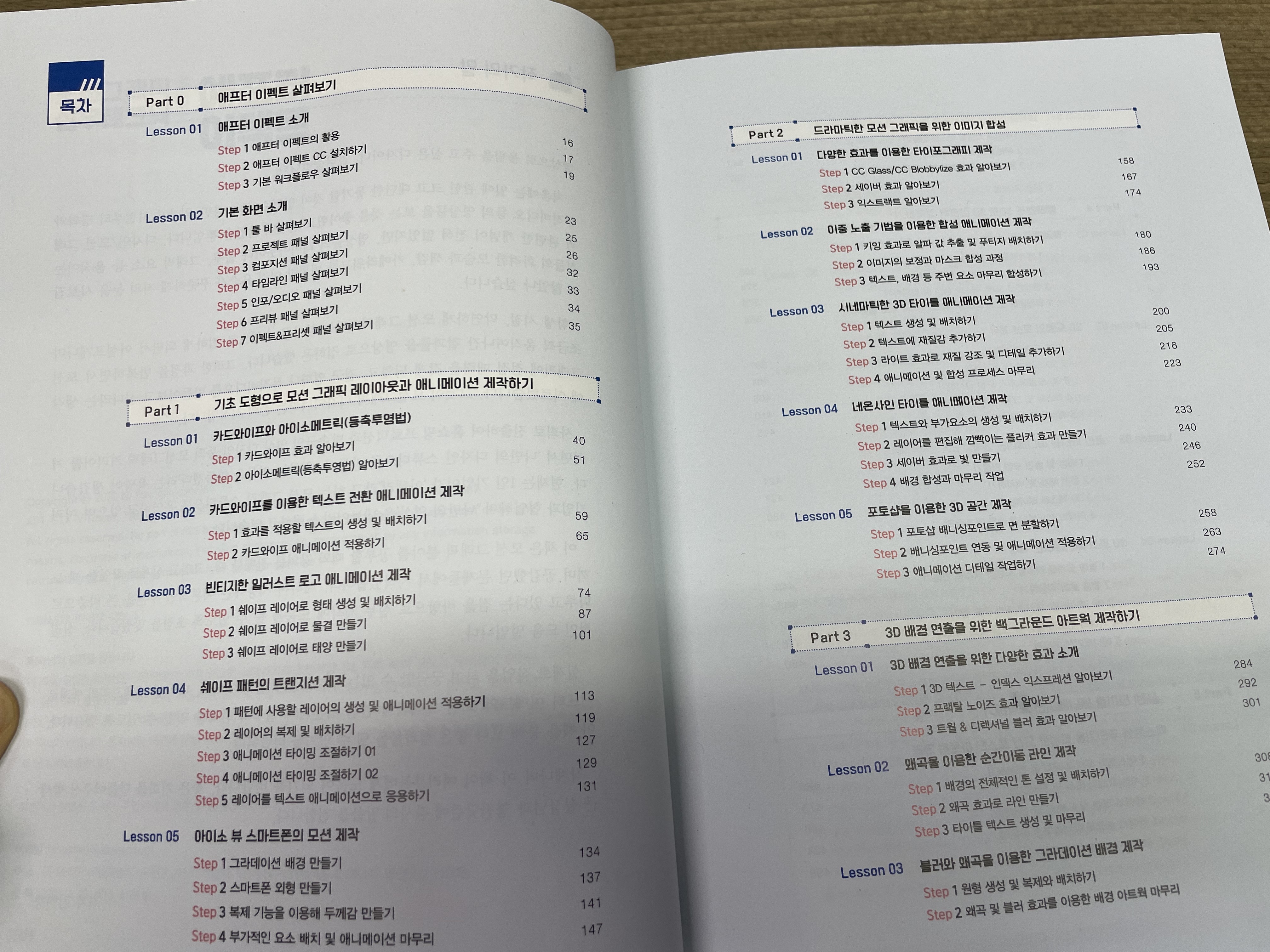 《모션그래픽 실무테크닉 with 애프터 이펙트》는 0~5개의 파트로 구성이 됩니다.