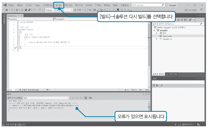4. 소스 코드를 입력했으면 메뉴에서 [빌드]→[솔루션 다시 빌드]를 선택하세요. 소스 파일의 저장·빌드가 시행됩니다.