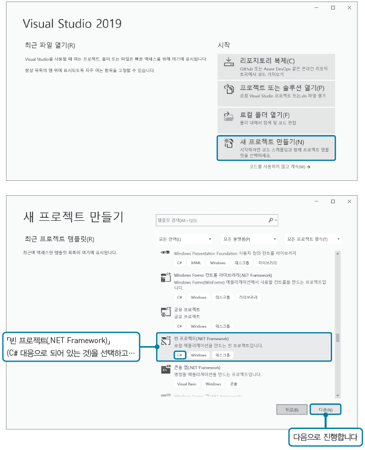 1. Visual Studio를 실행하면 나오는 화면에서 「새 프로젝트 만들기」를 클릭합니다. 이미 실행되어 있다면 메뉴에서 [파일]→[새로 만들기]→[프로젝트]를 선택해서 「새 프로젝트 만들기」 화면을 표시합니다. 화면이 표시되면 리스트의 스크롤을 내려서 「빈 프로젝트(.NET Framework)」(C# 대응으로 되어 있는 것)를 선택하세요.