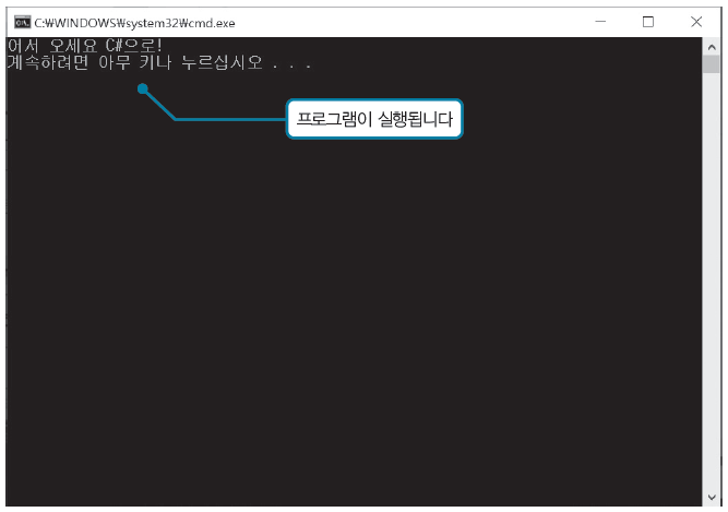5. 메뉴에서 [디버그]→[디버그하지 않고 시작]을 선택합니다. 명령 프롬프트가 자동으로 동작해서 프로그램이 실행됩니다. 실행을 종료하려면 아무 키나 누릅니다.