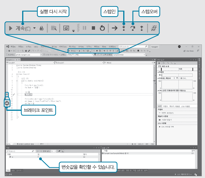 그 밖에도 오류 부분을 특정하기 위한 다양한 기술이 있습니다. 예를 들어, 「브레이크 포인트」로 실행을 일시 정지할 수 있습니다. 정지하고 싶은 행의 왼쪽 끝을 클릭하면 브레이크 포인트로 설정되고, 왼쪽 끝에 빨간색 동그라미가 표시됩니다. 이때 메뉴에서 [디버그]→ [디버깅 시작]을 선택하고 프로그램을 실행하면 브레이크 포인트에서 프로그램의 실행이 일시 정지됩니다.