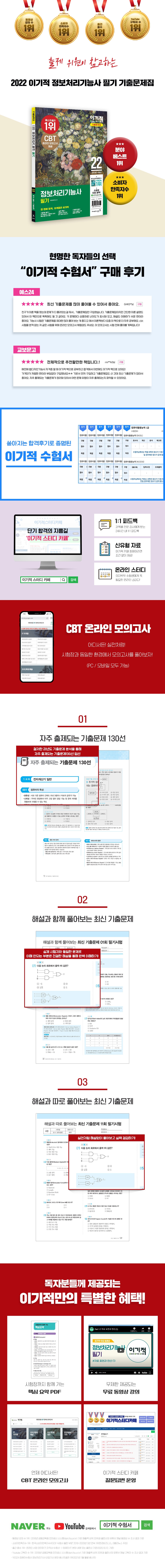 최근에 시행됐던 기출문제부터 과년도 기출문제 20회를 친절한 정답 및 해설과 함께 엮었습니다. 필기 시험은 뭐니 뭐니 해도 ‘누가 문제를 더 많이 풀었느냐’의 여부에 따라 합격의 길이 갈립니다. 기출문제 20회를 반복적으로 풀고 소화한다면 합격은 문제없습니다. 또한 혼자 공부하는 수험생들을 위해 정답과 해설을 자세하게 수록하였습니다. 공부를 할 때 틀리는 것은 중요하지 않습니다. 그 문제를 저희 <이기적 정보처리기능사 필기 기출문제집>과 함께 완벽하게 학습하여 시험장에서 틀리지 않는 것이 중요합니다!