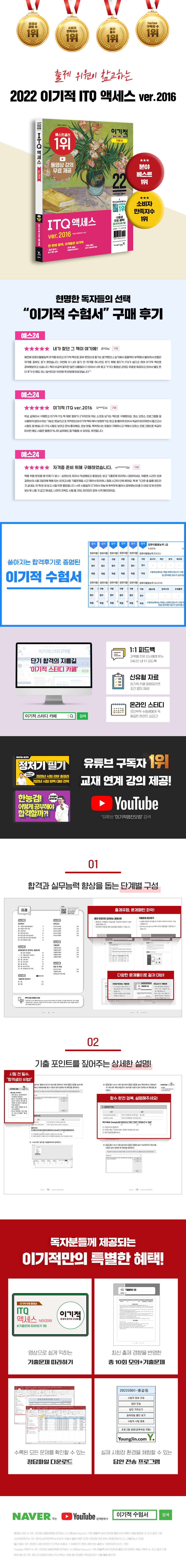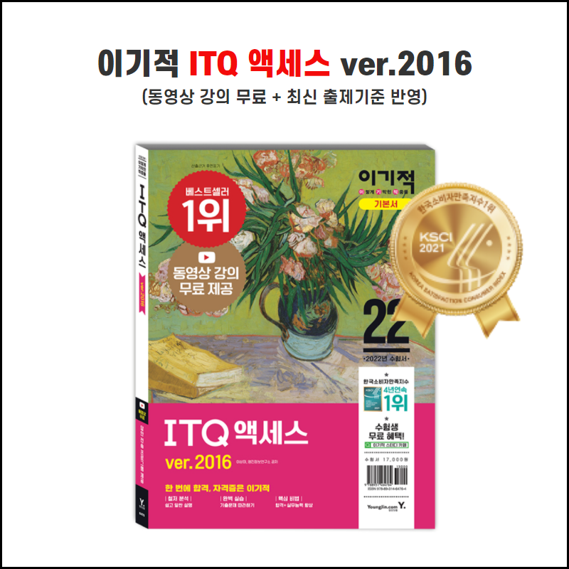 본 도서는 최신 출제기준을 적용한 도서로, ITQ 액세스 시험 경향을 분석하여 수험생들이 혼자서도 학습할 수 있도록 한 완벽 대비서입니다. 액세스 ver.2016을 기준으로 작성되었으며, 꼼꼼이론과 유형을 확인하는 기출문제를 통해 시험 유형을 익힐 수 있고, 모의고사 5회와 기출문제 5회로 시험에 철저하게 대비할 수 있습니다. 또한 홈페이지에서 제공되는 강의 영상으로 완벽한 독학을 도와드리고 있으며, 답안 전송 프로그램은 ITQ 시험장에서 사용하는 프로그램과 동일한 방법으로 실행되어 실전처럼 연습할 수 있습니다.