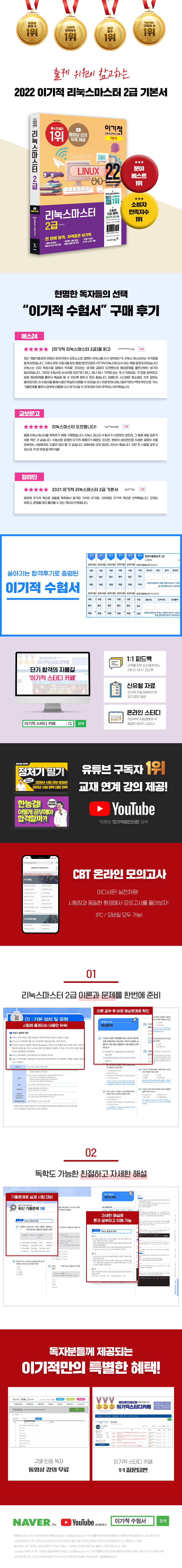 떠오르는 신흥 강자! 리눅스마스터 2급 2022년 도서가 이기적에서 출간되었습니다. 리눅스마스터 2급을 취득하기 위해 필요한 최대한의 것을 전부 제공해 드립니다. 시행처에서 발표한 출제기준에 완벽하게 맞는 핵심이론 내용과 이론을 공부한 뒤 바로 문제를 풀어볼 수 있는 구성은 수험생들이 스스로 어떤 내용을 더 공부해야 하는지, 어떤 내용에 더 집중해야 하는지 확인할 수 있도록 도와드릴 것입니다. 리눅스마스터 2급 합격을 영진닷컴에서 응원합니다!