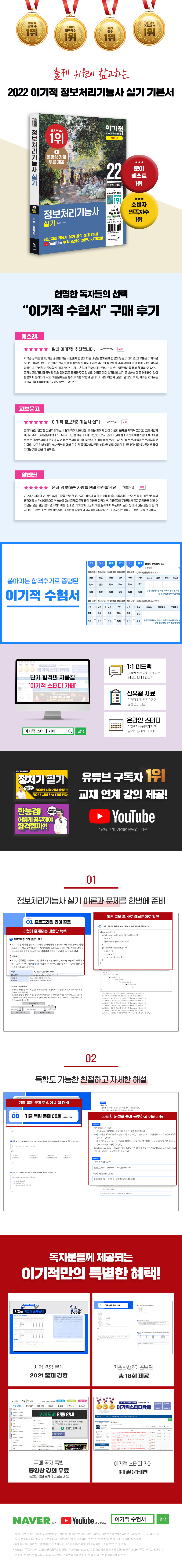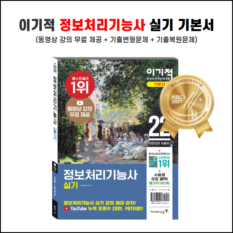 ‘2022 이기적 정보처리기능사 실기 기본서’ 도서가 새롭게 출간되었습니다. 2022년 출제기준 및 출제유형에 맞는 이론과 문제들로 꼭꼭 채워진 도서로 시험에 대비하실 수 있습니다. 핵심이론으로 내용을 공부한 뒤, 도서 내에 있는 ‘합격을 다지는 예상문제’로 실제 시험이 어떻게 출제되는지 감을 잡아보세요. 그 후, 기출 변형 문제와 기출 복원 문제로 마무리 정리를 하시면 됩니다. 정보처리기능사 합격을 이기적이 응원합니다!