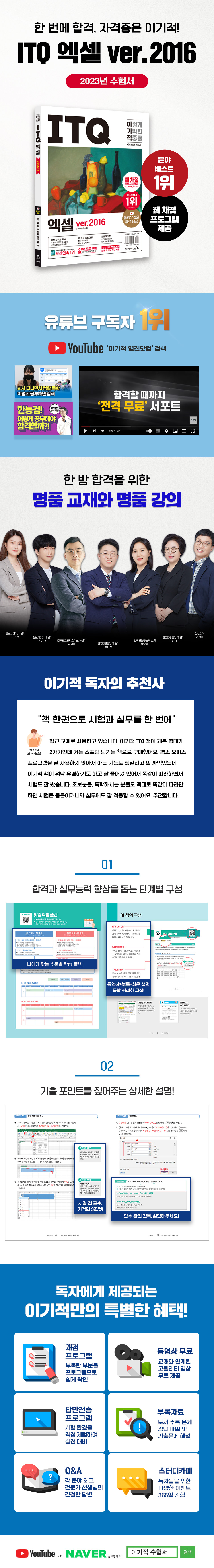 본 도서는 최신 출제기준을 적용한 도서로, ITQ 엑셀 시험 경향을 분석하여 수험생들이 혼자서도 학습할 수 있도록 한 완벽 대비서입니다. 엑셀 ver.2016을 기준으로 작성되었으며, 꼼꼼이론과 유형을 확인하는 기출문제를 통해 시험 유형을 익힐 수 있고, 모의고사 10회와 기출문제 10회로 실전에 철저하게 대비할 수 있습니다. 또한 홈페이지에서 제공되는 강의 영상으로 완벽한 독학을 도와드리고 있으며, 웹 채점 프로그램은 별도의 설치없이 온라인 접속을 통해 제공되어 쉽게 본인의 실력을 확인해 볼 수 있습니다.