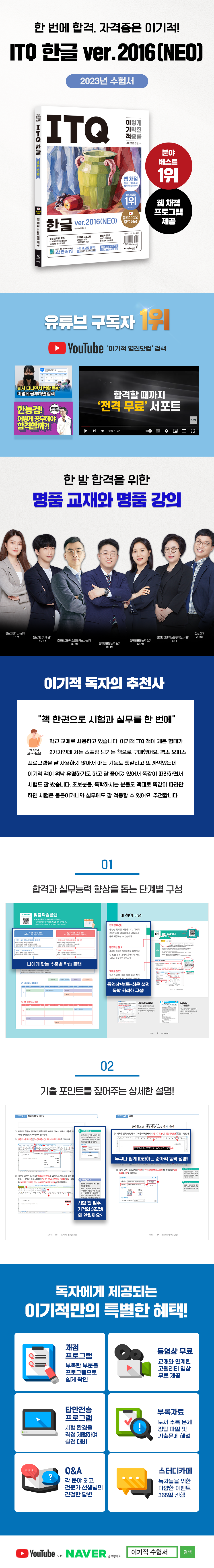 본 도서는 최신 출제기준을 적용한 도서로, ITQ 한글 시험 경향을 분석하여 수험생들이 혼자서도 학습할 수 있도록 한 완벽 대비서이다. 한글 ver.2016(NEO)을 기준으로 작성되었으며, 꼼꼼이론과 유형을 확인하는 기출문제를 통해 시험 유형을 익힐 수 있고, 모의고사 10회와 기출문제 10회로 시험에 철저하게 대비할 수 있다. 또한 홈페이지에서 무료로 제공되는 강의 영상으로 완벽한 독학을 돕고 있으며, 웹 채점 프로그램은 별도의 설치없이 온라인 접속을 통해 제공되어 쉽게 본인의 실력을 확인해 볼 수 있다.