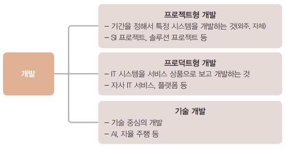 현장에서 진행되는 개발을 3가지로 분류하고 각 개발의 특성에 대해서 알아보겠습니다. 개발은 크게 프로젝트형 개발, 프로덕트형 개발, 기술 개발로 구분할 수 있습니다. 참고로, 실제 IT 현장에는 무수히 많은 종류의 개발이 있으며, 개발 종류가 명확하게 분류되어 있지는 않습니다.