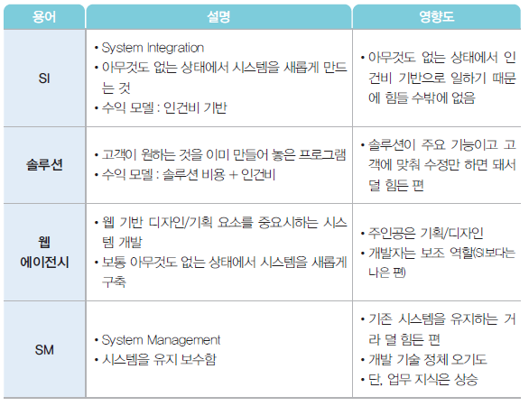 수익 모델은 대부분 인건비를 기반으로 하고 있습니다. 즉, 같은 개발을 하더라도 인건비를 아끼면 수익이 더 생기므로 다소 힘든 프로젝트 진행 구조입니다. 하지만 가장 많은 개발 사업이 일어나는 분야라서 장점과 단점이 명확히 있습니다.