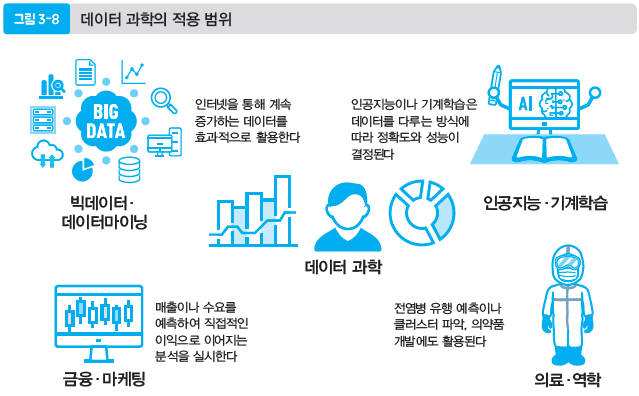 반면 데이터 사용법을 생각하기 위해 등장한 것이 데이터 과학(Data Science)입니다. 통계학과의 차이점은 데이터를 어떻게 보느냐 하는 부분뿐만 아니라 통계학에 정보 이론이나 경제 이론과 같은 다양한 이론을 접목시켜 데이터의 해석이나 활용까지 범위를 넓히고 있다는 점입니다. 즉, 그 「데이터를 어떠한 의미를 가지고 무엇에 사용할 수 있는가」, 「어떤 가치를 가지고 있고 어떻게 하면 효과적으로 활용할 수 있는가」라고 하는 데이터의 활용법에 이르기까지 깊이 파고들고 있는 것이 데이터 과학입니다(그림 3-7).