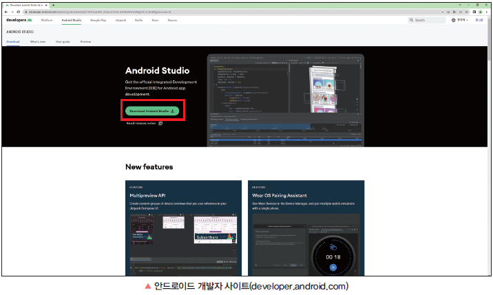 안드로이드 앱 개발 환경을 위해 먼저 안드로이드 스튜디오(Android Studio)를 설치하겠습니다. 안드로이드 스튜디오는 안드로이드 개발을 위해 프로그램을 작성하고 테스트하는 개발 도구로 개발자를 위해 구글에서 만들어 배포하고 있습니다. 안드로이드 스튜디오는 무료로 배포되며 구글 개발자 사이트를 통하여 다운로드할 수 있습니다. 구글 개발자 사이트(http://developer.android.com)를 방문하여 [DOWNLOAD ANDROID STUDIO] 버튼을 클릭합니다.