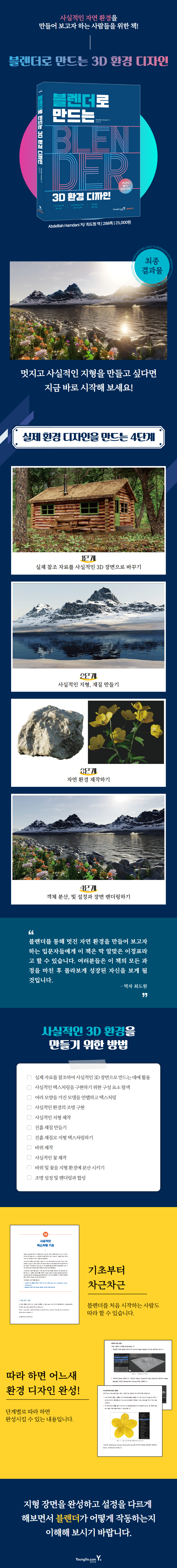 사실적인 자연 식물 제작하기와 환경 조명 구현하기, 지형 만들기 과정을 거치다 보면 이 책에서 보여주는 최종 결과물에 다다를 수 있게 됩니다. 혼자 해내기 어려웠던 부분들이 있었다면 이 책을 통해 여러분이 했던 실수들을 줄이고 전체적으로 블렌더가 어떻게 작동하는지 깨우칠 수 있게 됩니다.