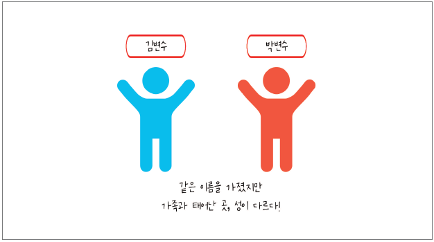 위 그림의 두 사람은 모두 ‘변수’라는 이름을 가졌지만 태어난 곳도 가족도 성도 다릅니다. 이처럼 같은 이름을 가진 변수라고 하더라도 다른 함수에서 선언되었다면 서로 다른 변수입니다. 즉, 어떤 함수의 중괄호 안에서만 사용할 수 있는 변수를 지역변수라고 합니다. 지역변수와 반대로 괄호 안에서 사용되지 않고 코드 내의 모든 곳에서 사용할 수 있는 변수를 전역변수라고 합니다. 전역변수는 괄호 밖에서 선언하여 사용할 수 있습니다. 예시를 살펴보겠습니다.