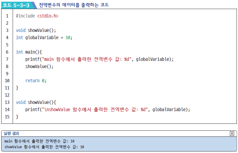 → 14번 줄: 전역변수 globalVariable를 출력합니다. main 함수와 같이 변수를 선언하지 않았음에도 같은 값을 출력합니다.