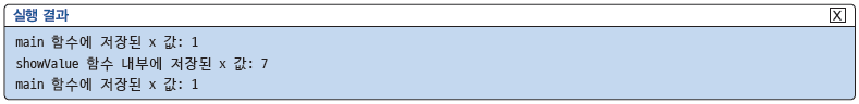 → 10번 줄: main 함수 내부에 저장된 x 값을 출력합니다. showValue 함수 내부에서 x 안에 7을 저장했음에도 main 함수 내