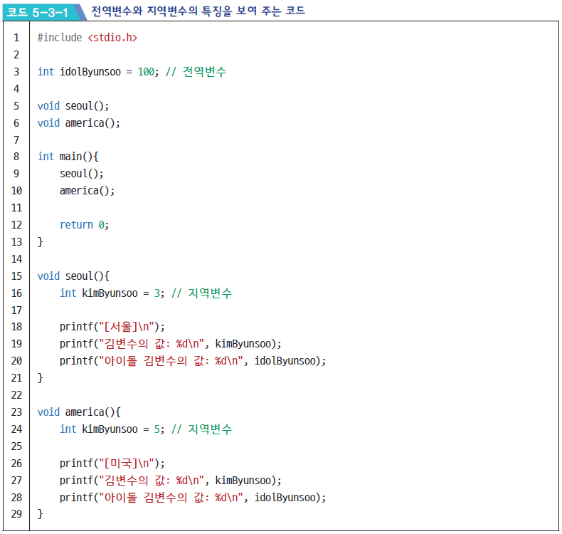 [코드 5-3-1]에서 kimByunsoo라는 변수는 16, 24번 줄에 두 번 정의되었지만, 각각 다른 값을 출력하고 있습니다. 반면 idolByunsoo라는 이름을 가진 변수는 함수 바깥에서 선언되어 모든 함수에서 같은 값을 출력하고 있습니다. 이와 같이 함수 내에서만 유효한 변수를 지역변수, 코드 내에서 모두 사용가능한 변수를 전역변수라고 합니다. 지역변수의 유효 범위에 대해 더 상세하게 알아보겠습니다.