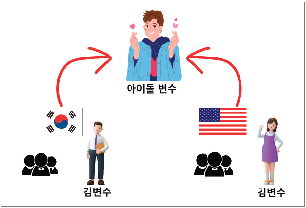 매개변수는 함수에서 정의한 변수의 한 종류로, 매개변수는 정의한 함수 내부에서만 사용할 수 있습니다. 이번 포스팅에서는 변수가 사용되는 ‘범위’에 대해 알아보겠습니다. 이해를 돕기 위해 먼저 글로벌 아이돌 김변수, 일반인 김변수 씨를 예시로 들어 설명하겠습니다. 전 세계를 오가며 활발히 활동하고 있는 글로벌 아이돌 김변수는 전 세계 사람들이 아는 톱스타입니다. 한국의 서울에 사는 김변수 씨는 funcA라는 회사를 다니는 회사원이며, 미국에 사는 김변수 씨는 funcB 대학교를 다니는 대학생입니다