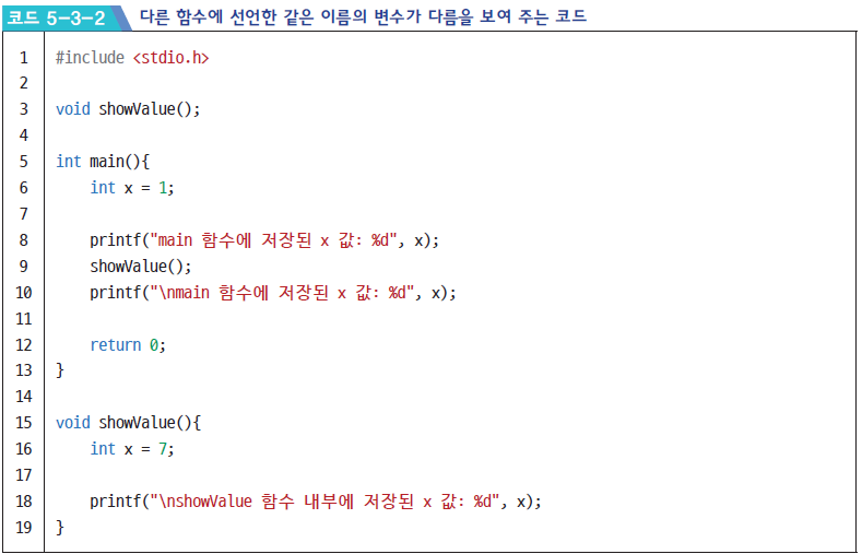 showValue 함수 안에서 선언한 int x와 main 함수에서 선언한 int x는 같은 이름을 가졌지만 다른 변수입니다. 예를 들어, 다음 그림을 보면서 생각해 보면 쉽게 이해할 수 있습니다.